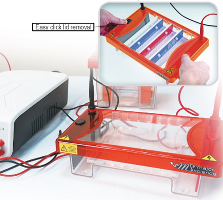 中型水平電泳ME15-7-10-15為一套通用及廣泛的水平凝膠電泳系統,基本的配置有3個托盤: 15 x 7 公分、15 x 10 公分 和 15 x 15公分,所以不需額外另外購買配件。通用的齒梳和選配的托盤允許每個凝膠最多可同時跑210個樣本。