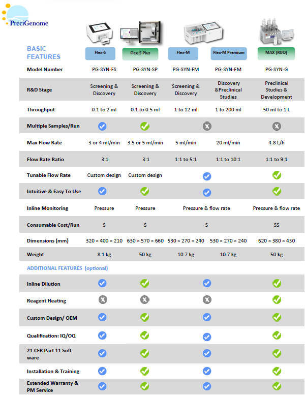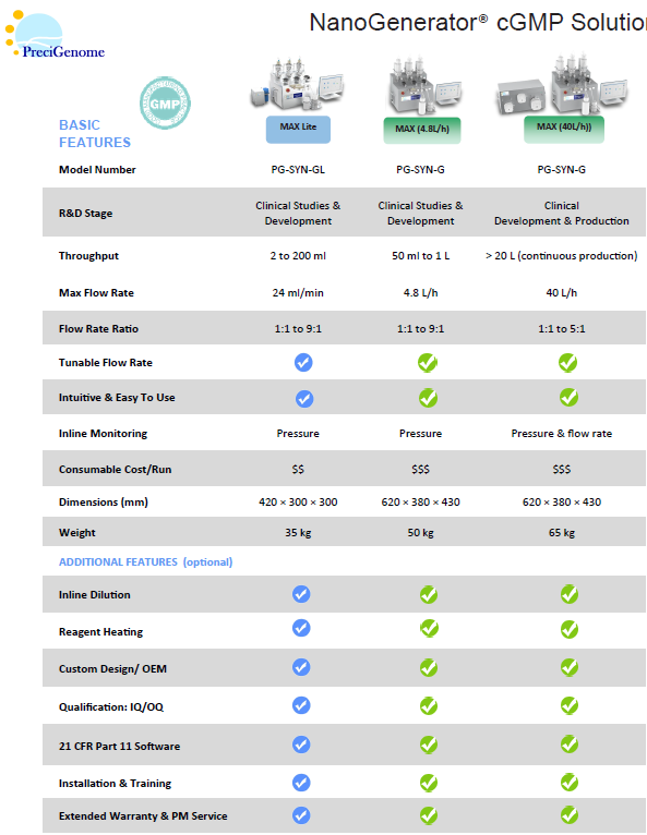 PreciGenome 的 NanoGenerator® 平台採用壓力驅動的微流體技術,可在多種生產規模下穩定合成奈米粒子。