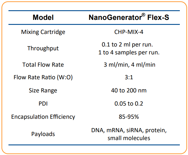 NanoGenerator® Flex-S 是一款用於奈米顆粒合成的高性能配方研發儀器。應用範例包括 脂質奈米顆粒 (LNP)、脂質體、PLGA 等。