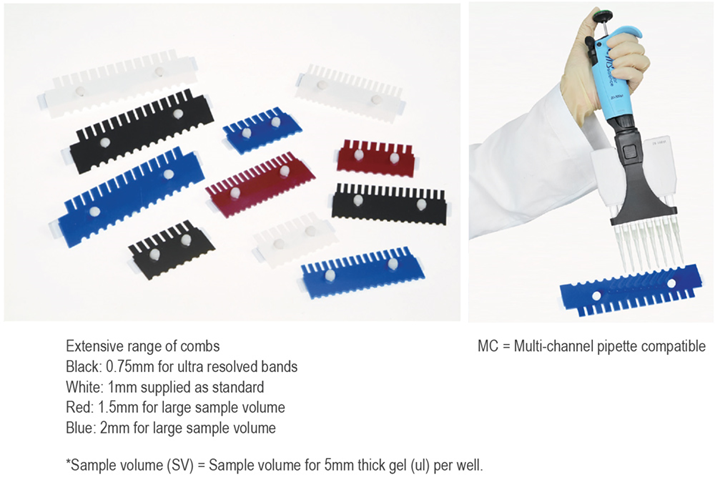 Midi 系列專為常規水平凝膠電泳設計,具備廣泛的多功能性。所有凝膠台均採用注塑成型結構,確保耐用性與防漏性能。多樣化的特殊梳子設計可有效提升樣本上樣量。